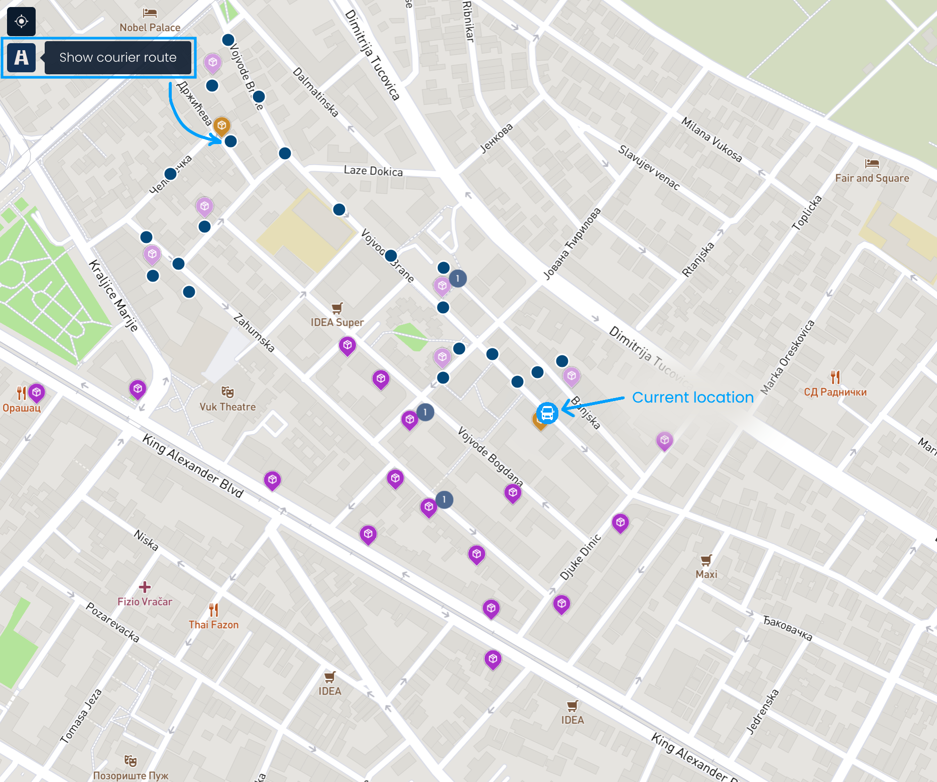 Um zu sehen, wo der Kurier gerade ist, klick auf den Standort des Kuriers anzeigen Button. Frühere Bewegungen kannst du sehen, wenn du auf den Kurier-Route anzeigen Button klickst. Die Route wird als Punkte angezeigt und jeder Punkt steht für eine besuchte Station. Wenn du auf einen dieser Punkte klickst, wird dir die Uhrzeit des Besuchs angezeigt.