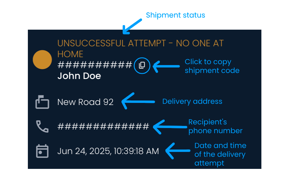 Du kannst eine bestimmte Sendung finden, indem du den Sendungscode, den Namen des Empfängers oder die Lieferadresse in der Suchleiste eingibst. Wenn du auf die Stecknadel klickst, richtet sich die Karte so aus, dass die gewünschte Sendung zentriert und herangezoomt wird.