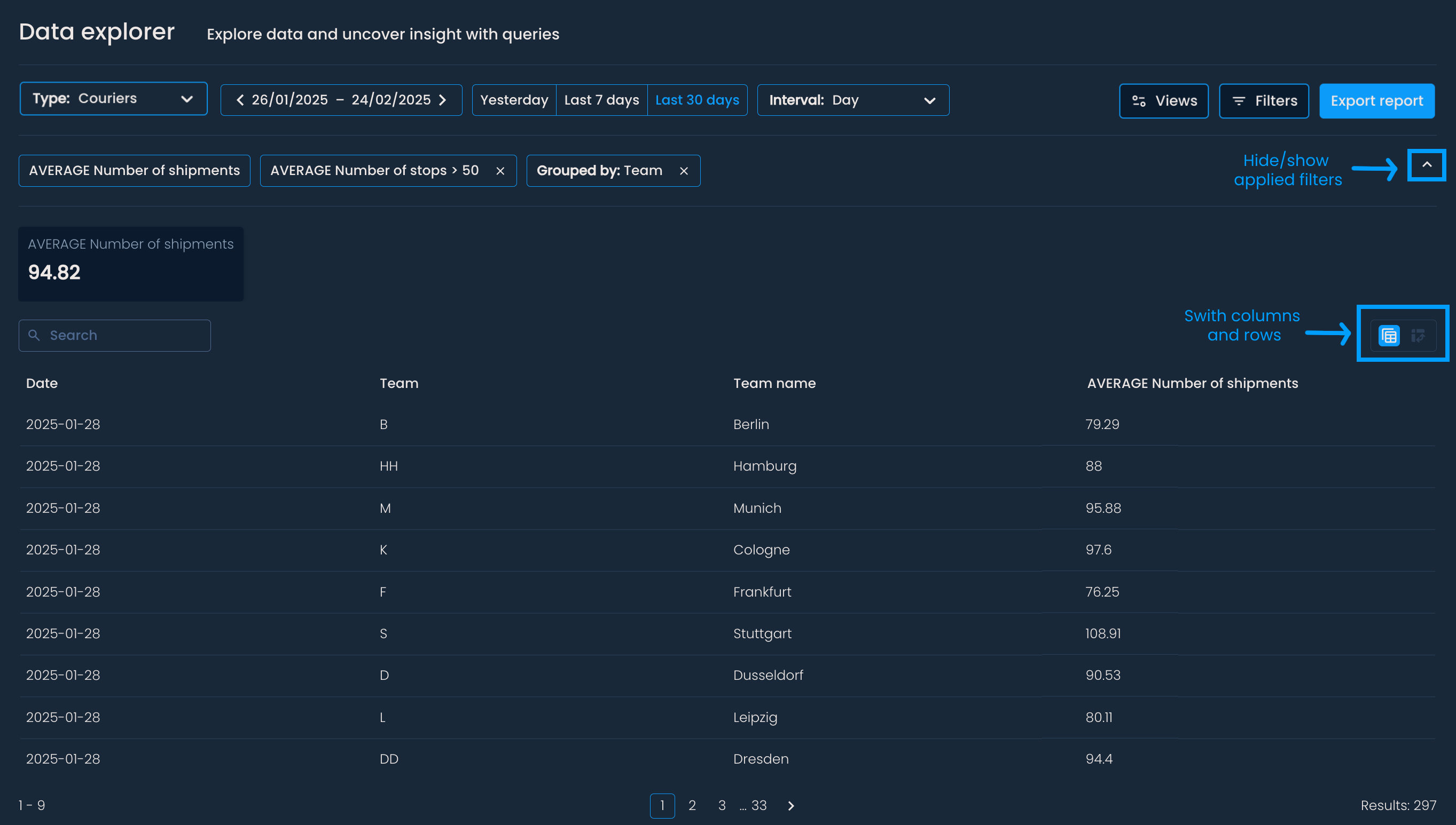 Du kannst Ergebnisse nach Teams, virtuellen Teams oder Kurier*innen gruppieren.
