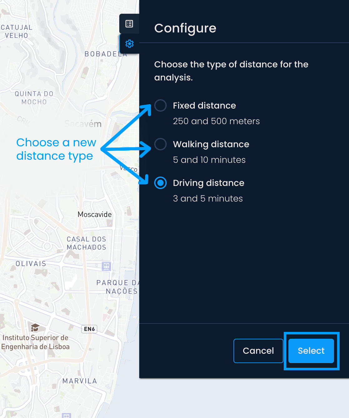 To change the distance, open the Configure menu by clicking the corresponding tab in the top right corner. Choose the option you want to implement, and then click Select.
