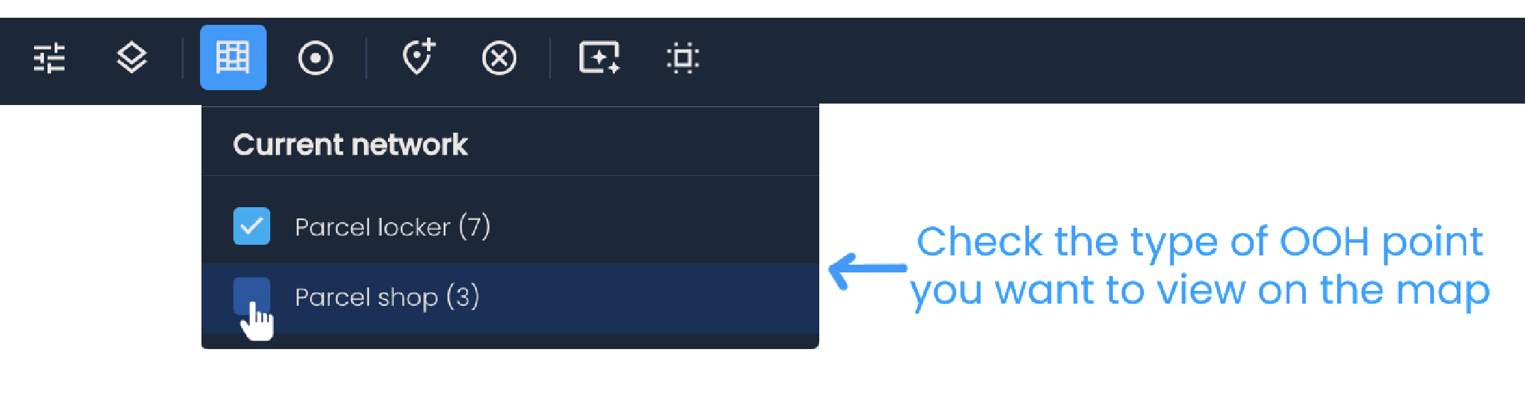Click Show current network and then choose the type of OOH points you want to view on the map. If the delivery area includes parcel lockers and parcel shops, both options will be available.