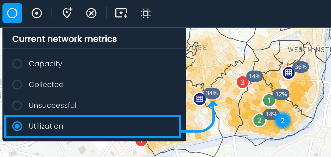To overlay performance data on each location, click Change current network metric and select a metric, for example: