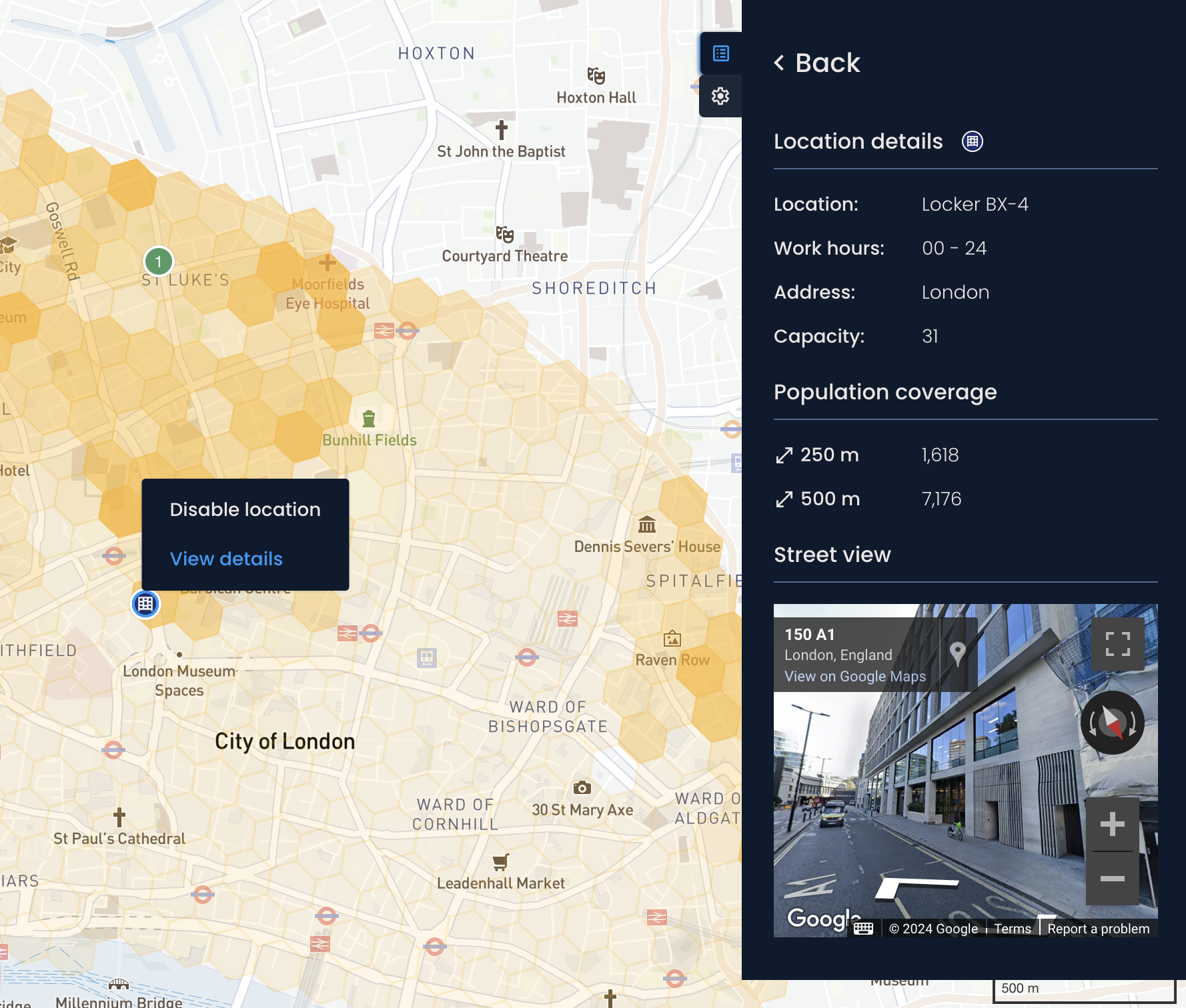 Right-click a location and select View details to access additional information, such as its working hours, capacity, and Street View.