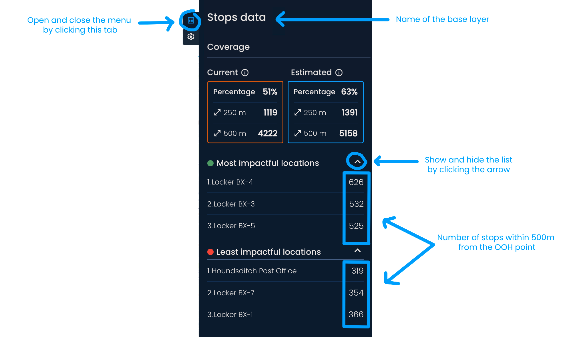 Most impactful locations - A list of three existing OOH points with the highest coverage compared to the rest in the delivery area.