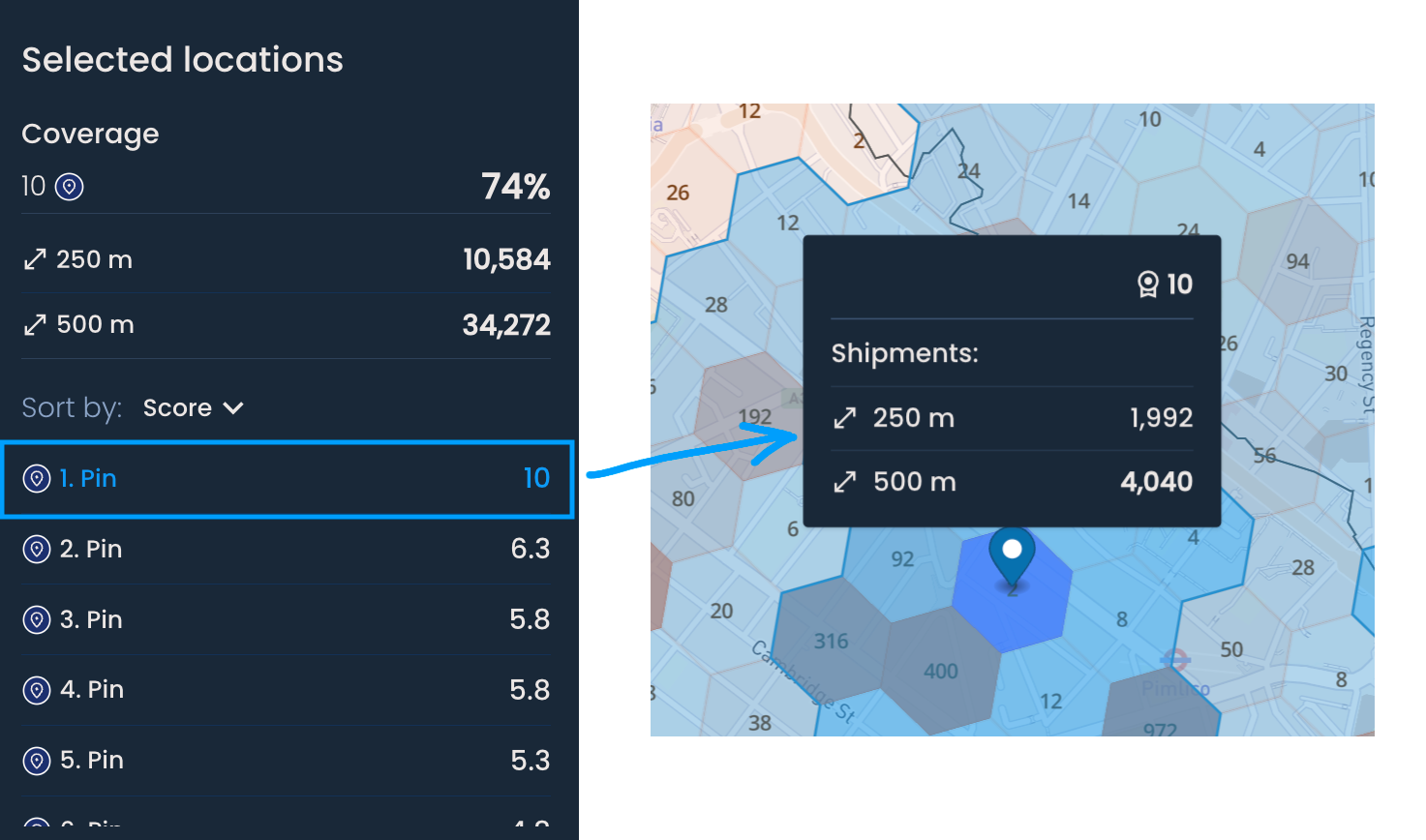 After generating suggestions or manually adding a distance pin, the Selected locations menu will activate. This is helpful if you want to understand the impact of new network changes (e.g., generated locations or manually added distance pins).