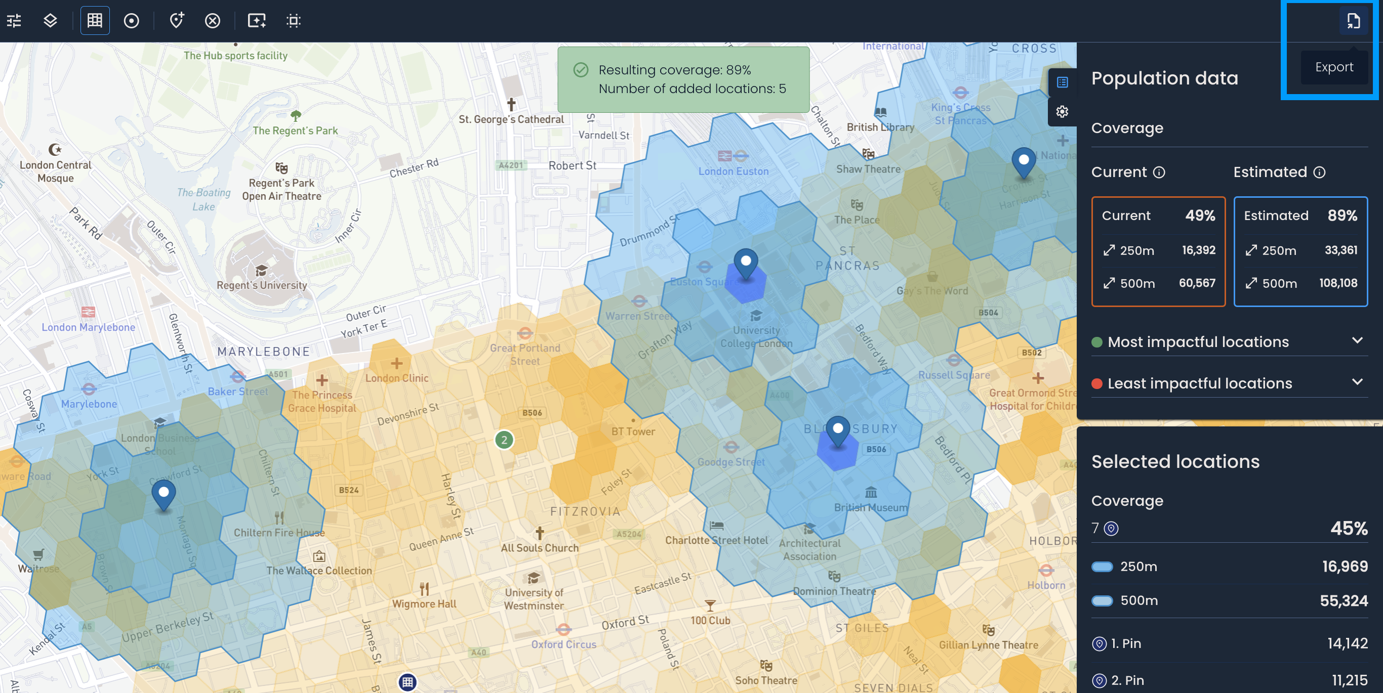 Click the Export button in the top right corner of the screen to download the results of your OOH network analysis as an Excel (xlsx) file.