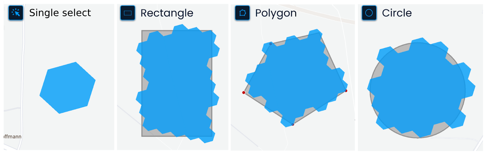Click on the map to start the selection, and then move the cursor until the circle covers the desired area. Click again to complete the selection, and hexagons will be added or removed from the selected area.