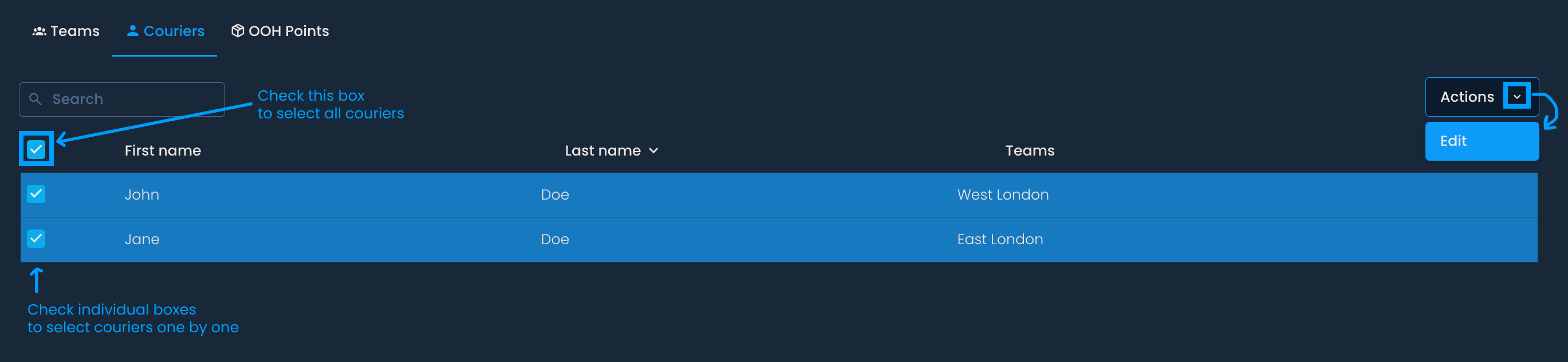 To update the virtual teams for multiple couriers at once, check the box next to each courier’s name, or select all couriers by checking the box at the top of the column. Then, click the Actions button and choose Edit. From there, select the virtual team you want to assign to the couriers, or remove the shared virtual team for the selected couriers.