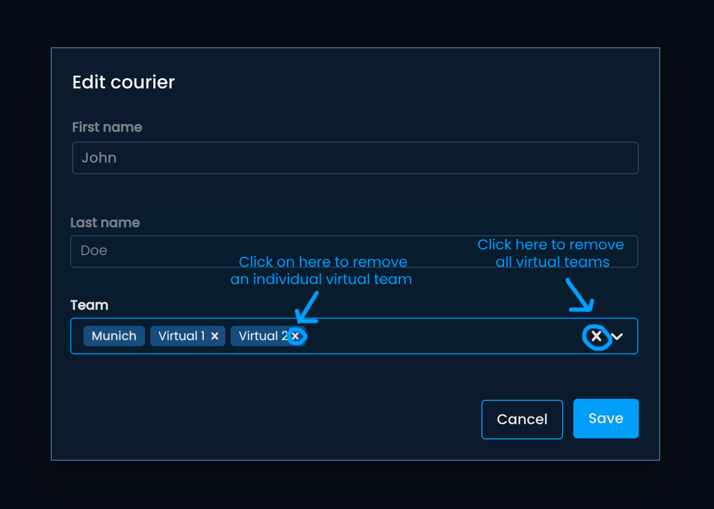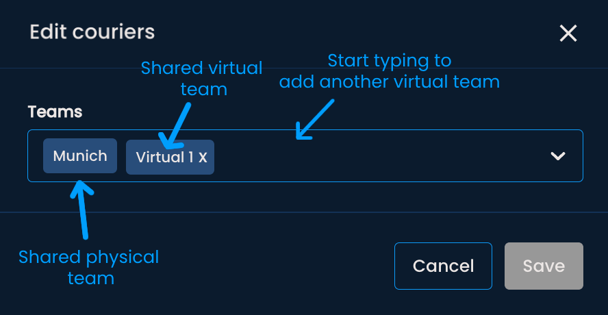 Assign the courier to a virtual team, either by typing in the team's name or finding it in the dropdown menu.