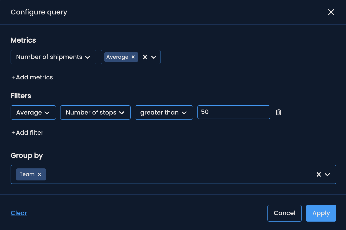 You can filter results to display only those that meet certain criteria based on selected metrics. For example, you may want to view results only for couriers who, on average, have fewer than 50 stops.