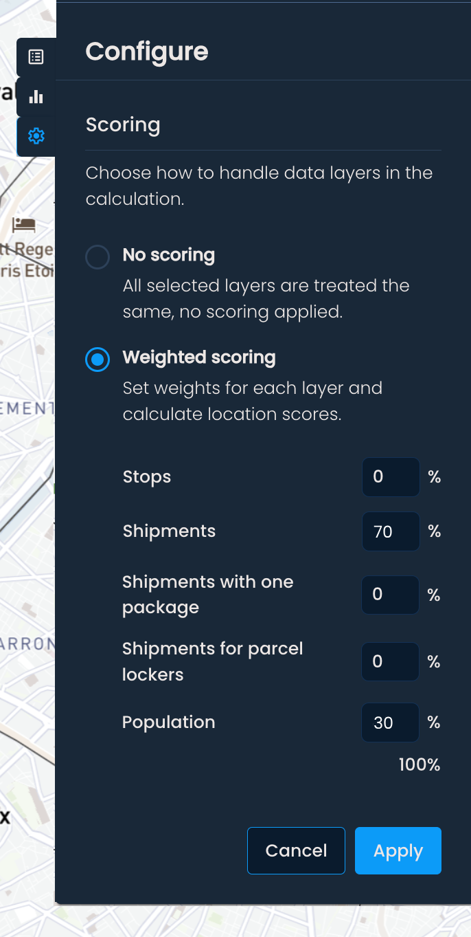 Select Weighted scoring and assign a weight (0–100%) to each available data layer. Only layers with a non-zero weight will influence the recommendations.