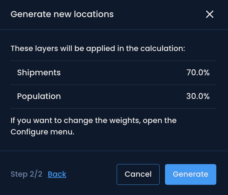 When you run any modelling feature (e.g., Generate locations), the configured weights will be applied to the recommendations. You can review the active layers and their weights in step 2 of the generation process. To adjust them, open the Configure menu and update as needed.