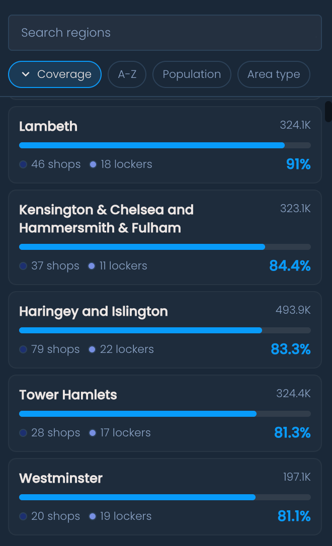The Coverage overview panel also contains a list of all regions within the country. For each region, you can see: