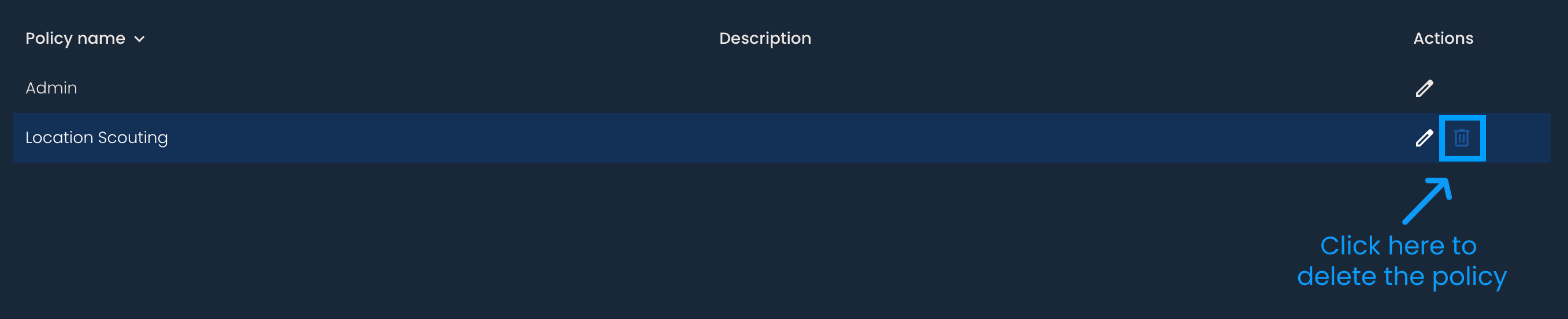 Per eliminare una policy, clicca sull'icona del cestino accanto al suo nome nella colonna Azioni e poi premi Elimina.