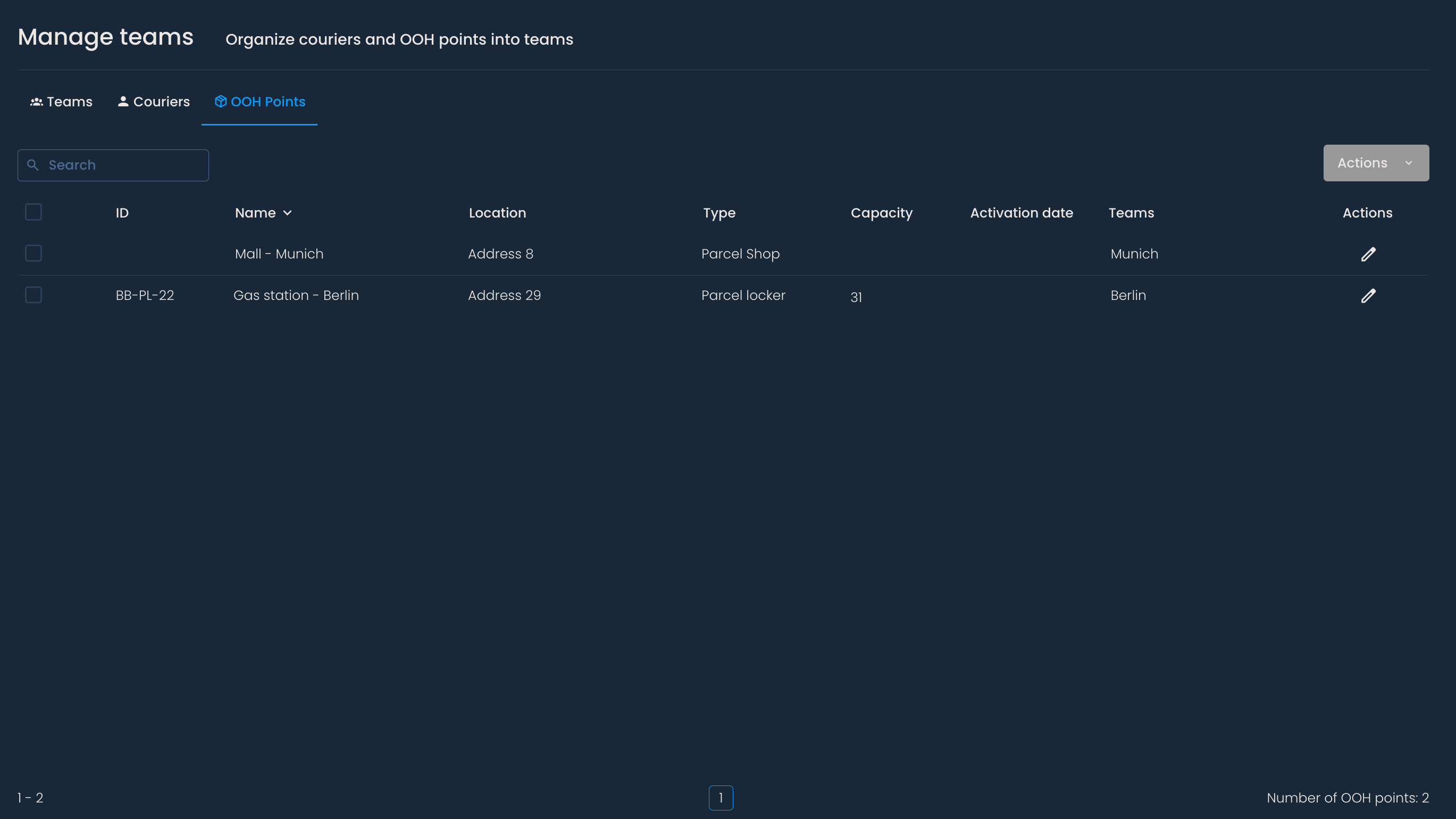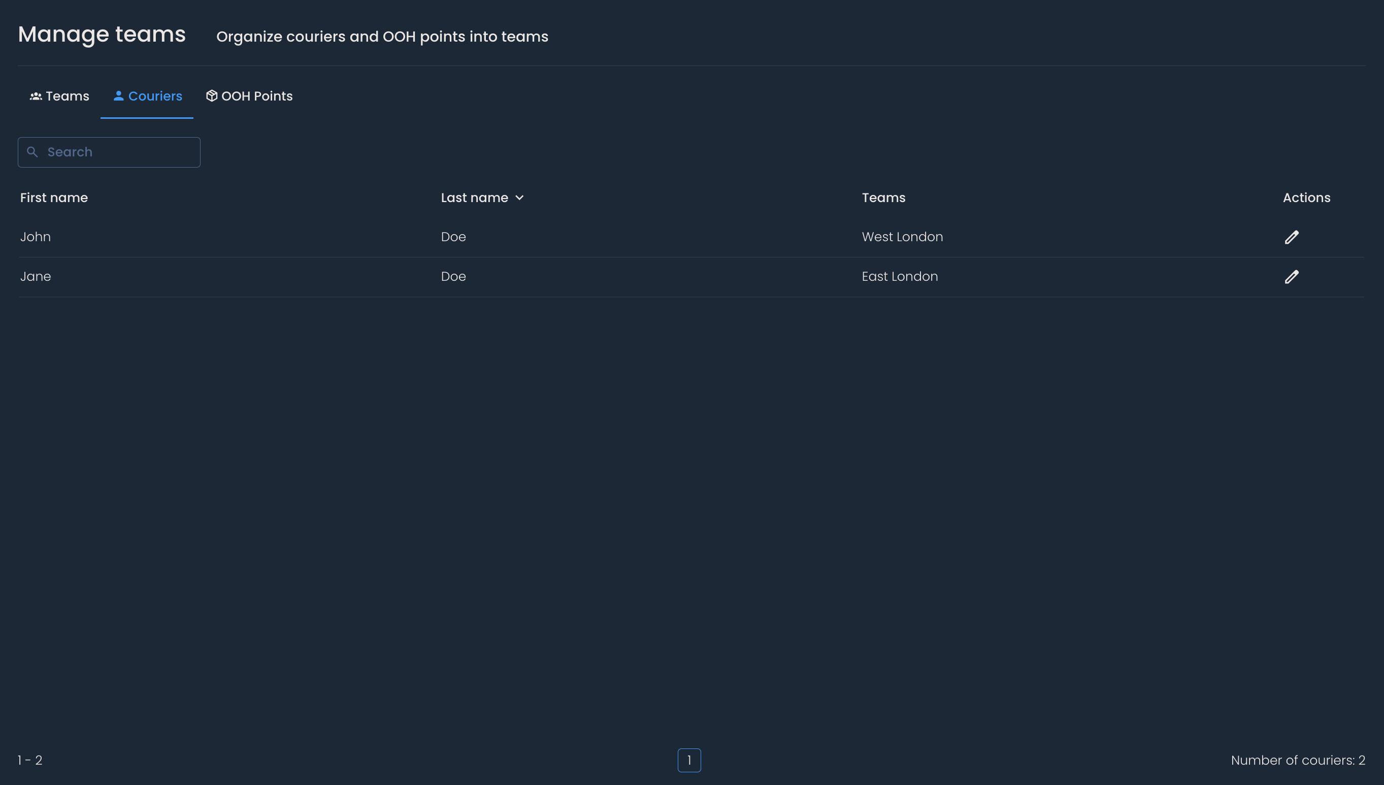 Sulla pagina di Gestire i team, puoi visualizzare un elenco di corrieri e punti OOH, vedere a quali team appartengono e raggrupparli in team virtuali.