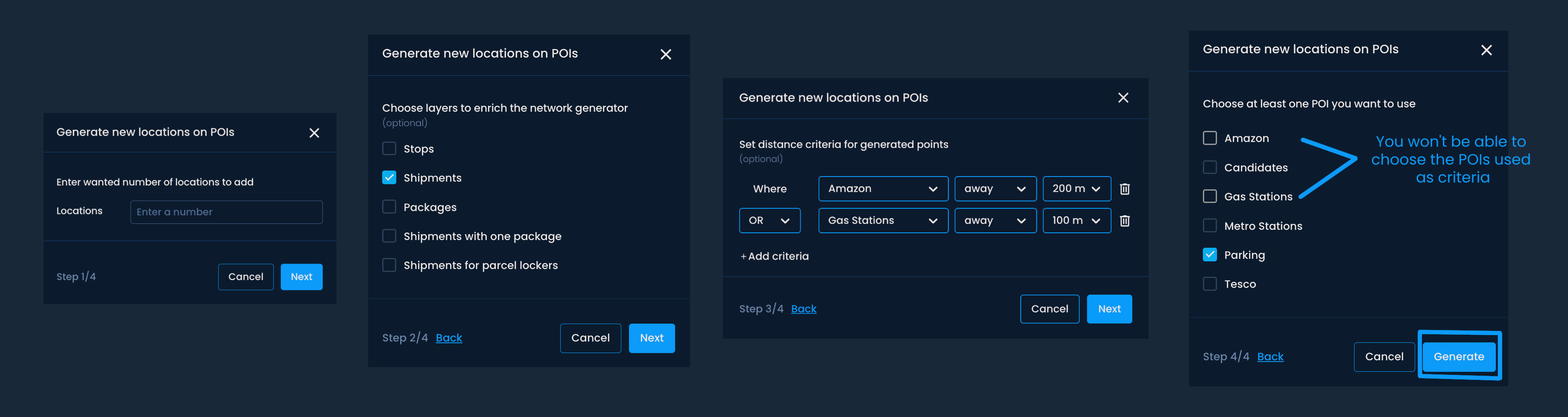 Per ottenere suggerimenti basati sui POI, clicca su Genera > Genera località sui POI.