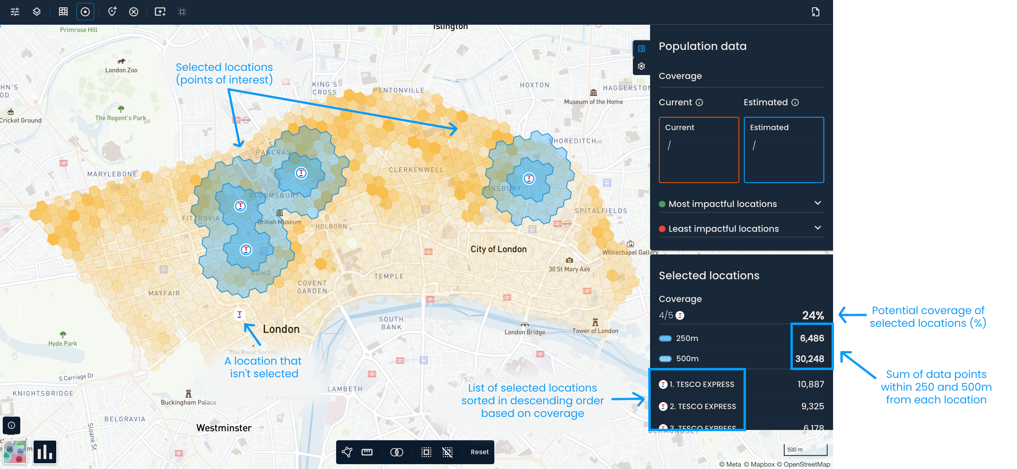 Možeš izračunati pokrivenost jedne ili više lokacije, čak iako one nisu deo tvoje OOH mreže. Tako možeš brzo oceniti potencijal partnerstva sa pumpama, šoping centrima, super marketima i sličnim objektima. Takođe, možeš bolje razumeti OOH mrežu svojih konkurenata.