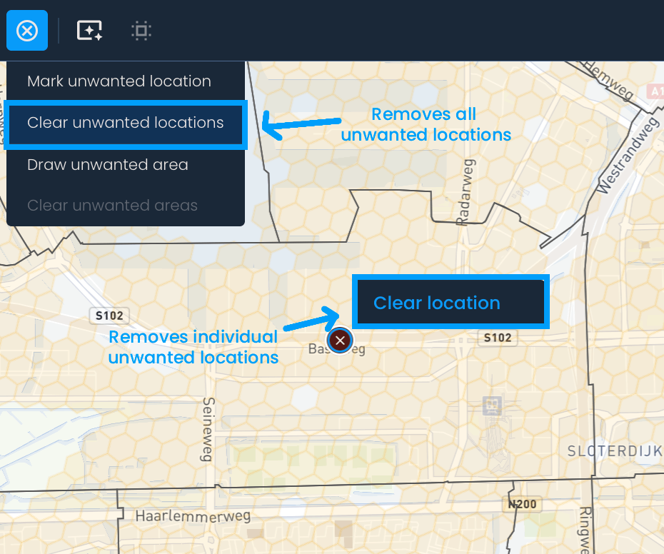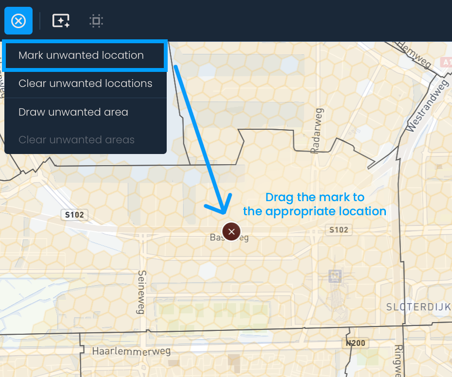 Ukoliko želiš da označiš specifičnu lokaciju, klikni na dugme Upravljanje neželjenim lokacijama i zatim na opciju Označi neželjenu lokaciju. Crveni kružić će se pojaviti na mapi nakon čega ga možeš prevući do lokacije koju želiš da isključiš iz analize. Ovaj proces možeš ponavljati više puta da označiš sve neželjene lokacije.