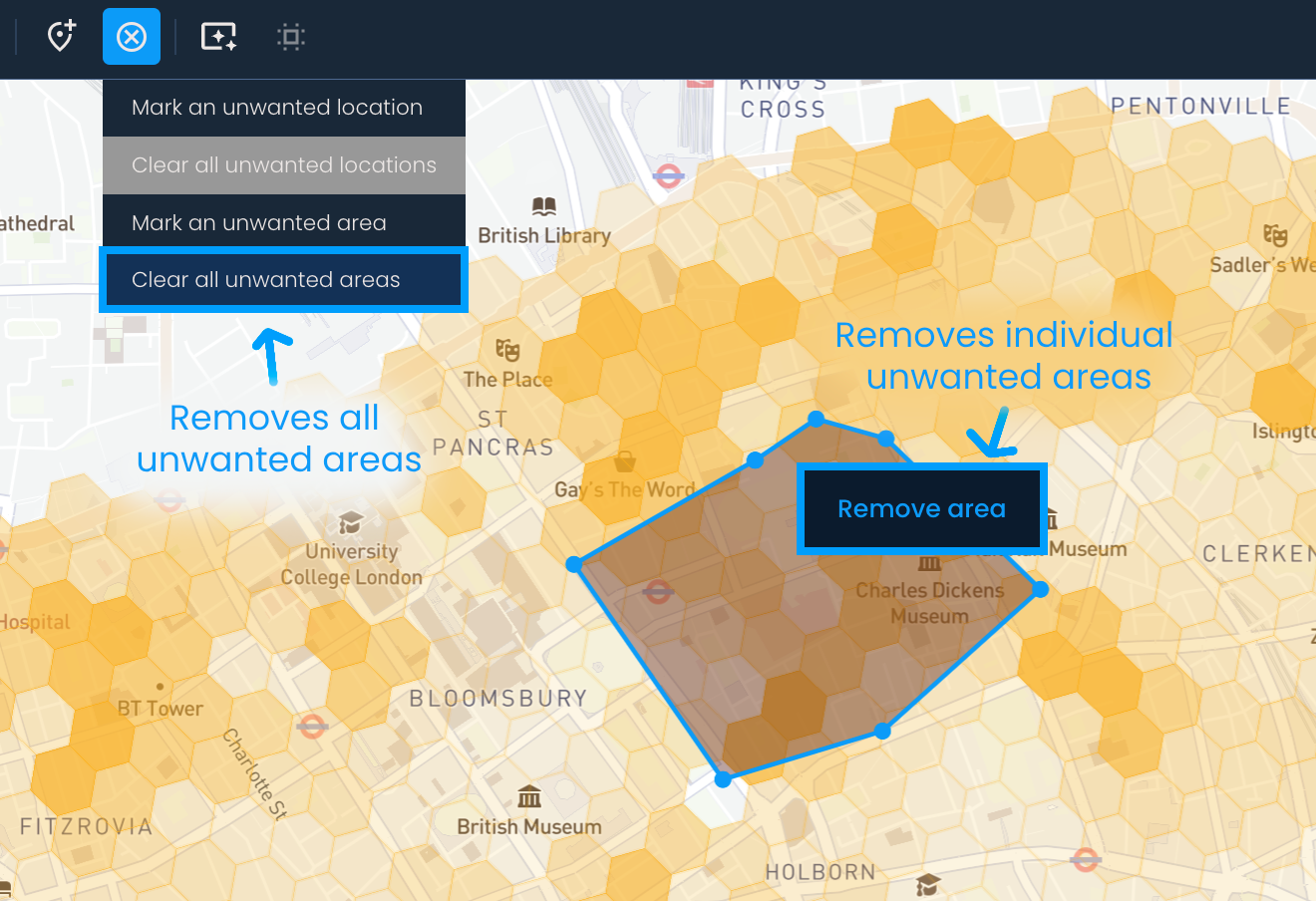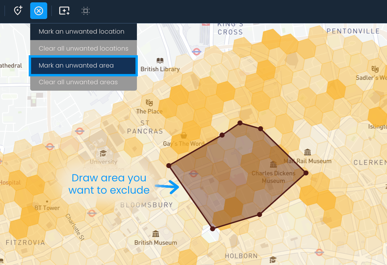 Ukoliko želiš da označiš oblast, klikni na dugme Upravljanje neželjenim lokacijama i zatim na opciju Označi neželjenu oblast. Zatim opctraj oblast koju želiš da isključiš iz analize. (Da zatvoriš poligon, potrebno je da na kraju ponovo klikneš na početnu tačku.)
