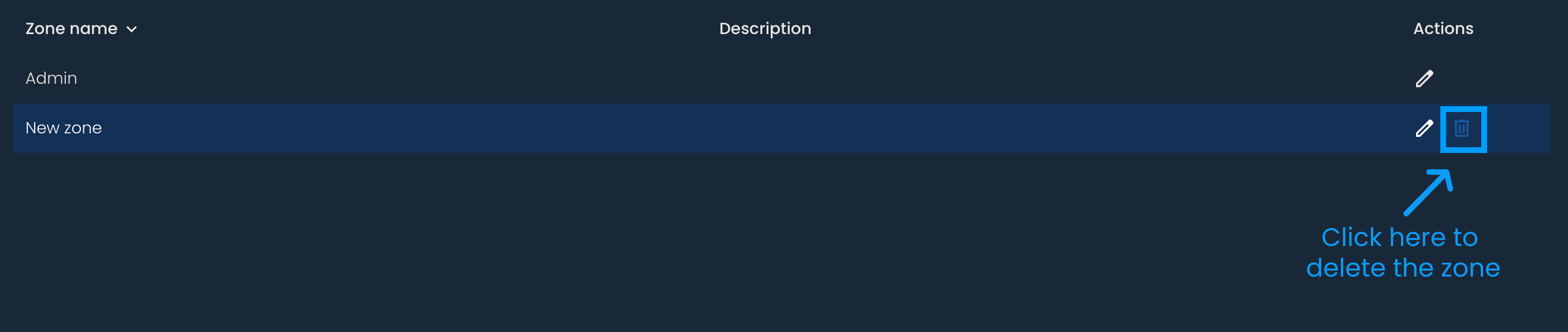 Klikni na korpu pored imena zone i zatim na dugme Izbriši.