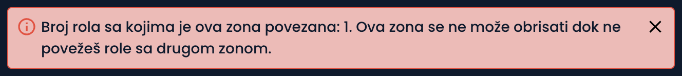 Ukoliko je zona dodeljena nekoj roli, ona se ne može izbrisati sve dok se rola ne poveže sa drugom zonom. U tom slučaju, prikazaće se sledeće obaveštenje: