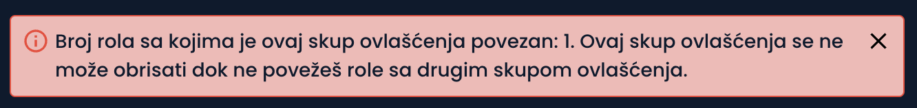 Nećeš moći da izbrišeš skup ovlašćenja ukoliko je već dodeljen nekoj roli. Potrebno je da se rola poveže sa drugim skupom ovlašćenja, nakon čega ćeš moći da izbrišeš postojeći.