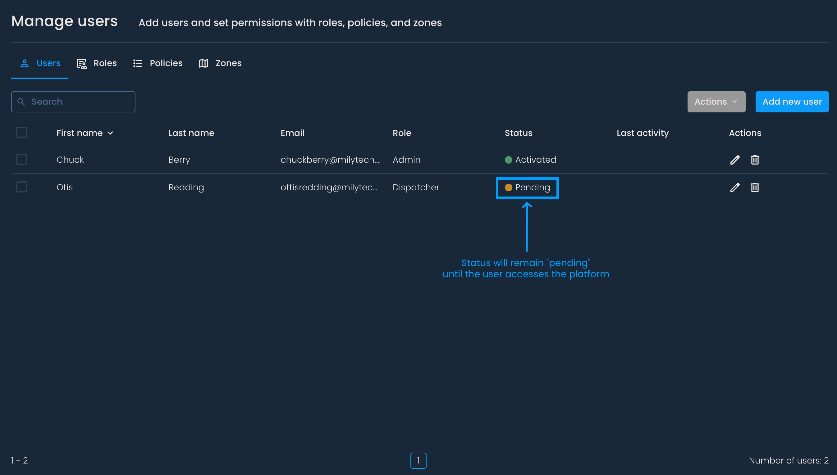 Novi korisnik će se pojaviti na listi. Kolona Status pokazuje da li je nalog aktiviran ili je još na čekanju.