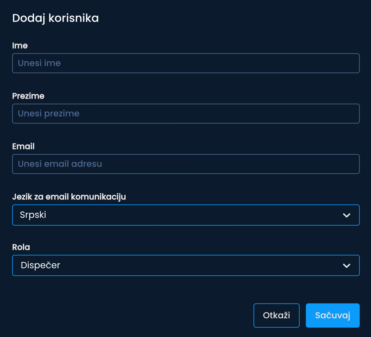 Unesi ime i prezime osobe za koju kreiraš nalog i njihovu poslovnu email adresu. Zatim, izaberi jezik koji će se koristiti u mejlovima za kredencijale i verifikacione kodove. Na kraju, izaberi rolu koja će se dodeliti korisniku i klikni Sačuvaj.