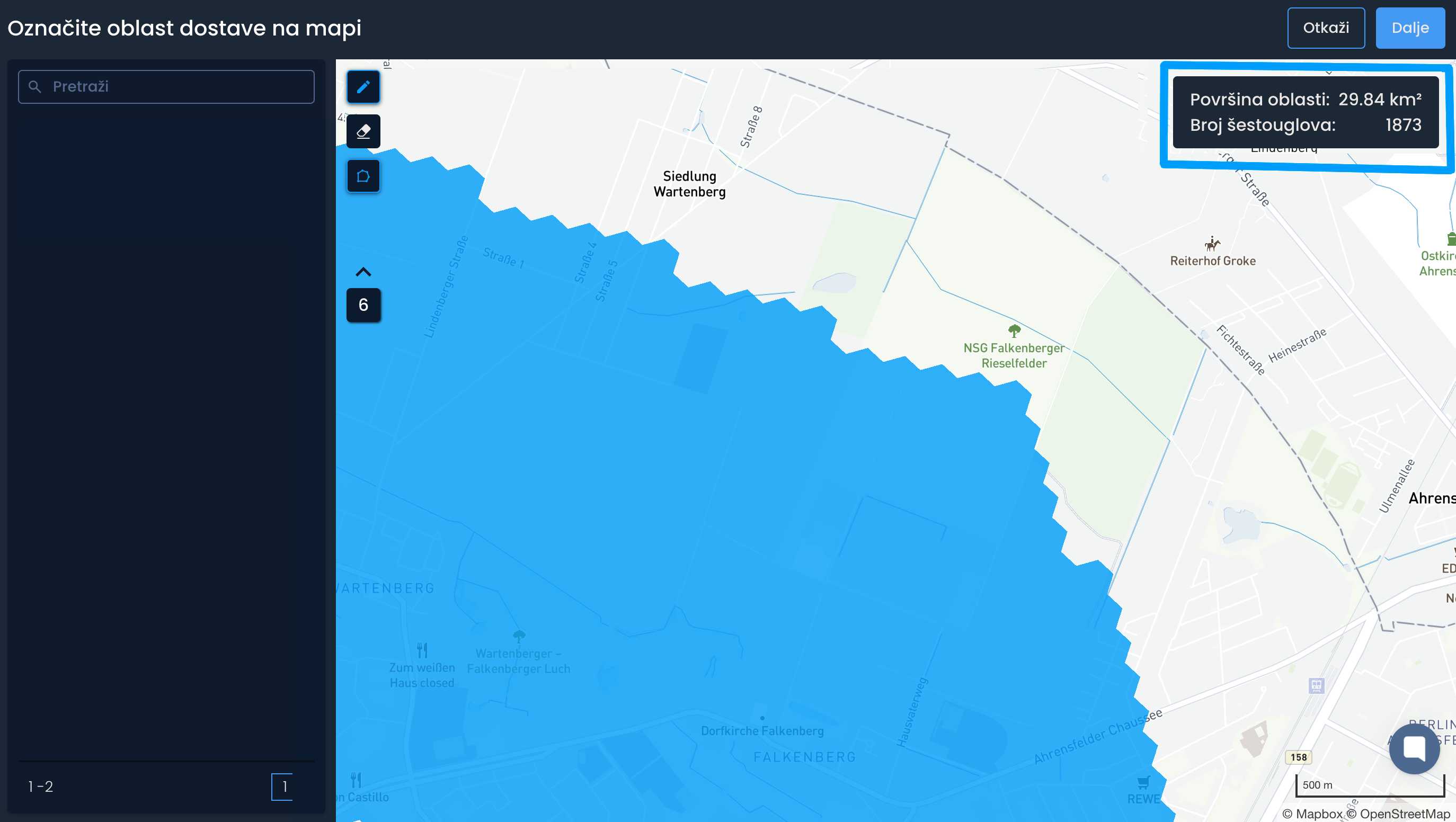 Zatim izaberi tip selekcije i olovku i iscrtaj oblast dostave. U gornjem desnom uglu ćeš videti veličinu dostavne oblasti u km² i broj heksagona.