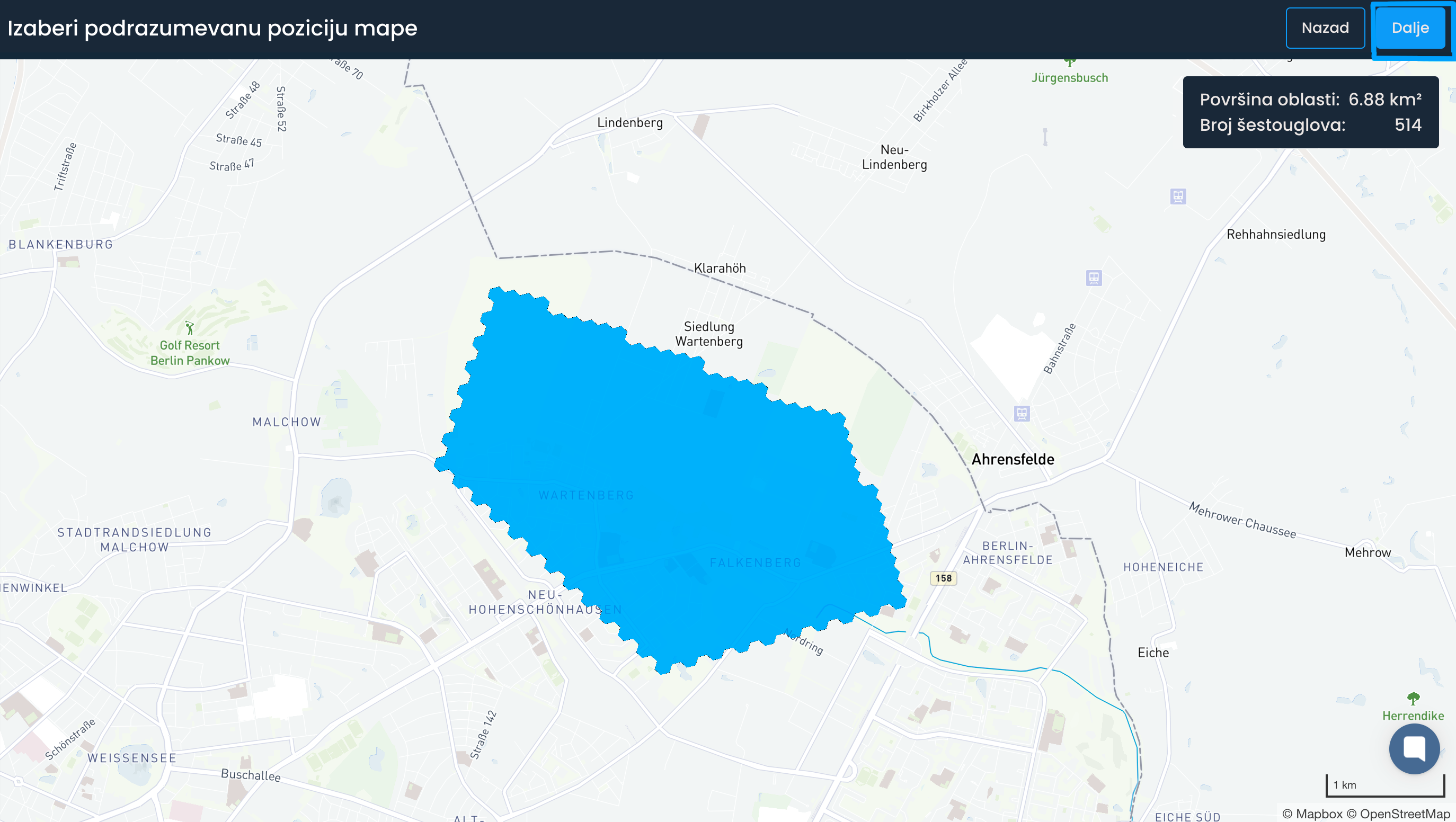 Nakon što klikneš Dalje, mapa će se automatski zumirati na nacrtanu oblast.