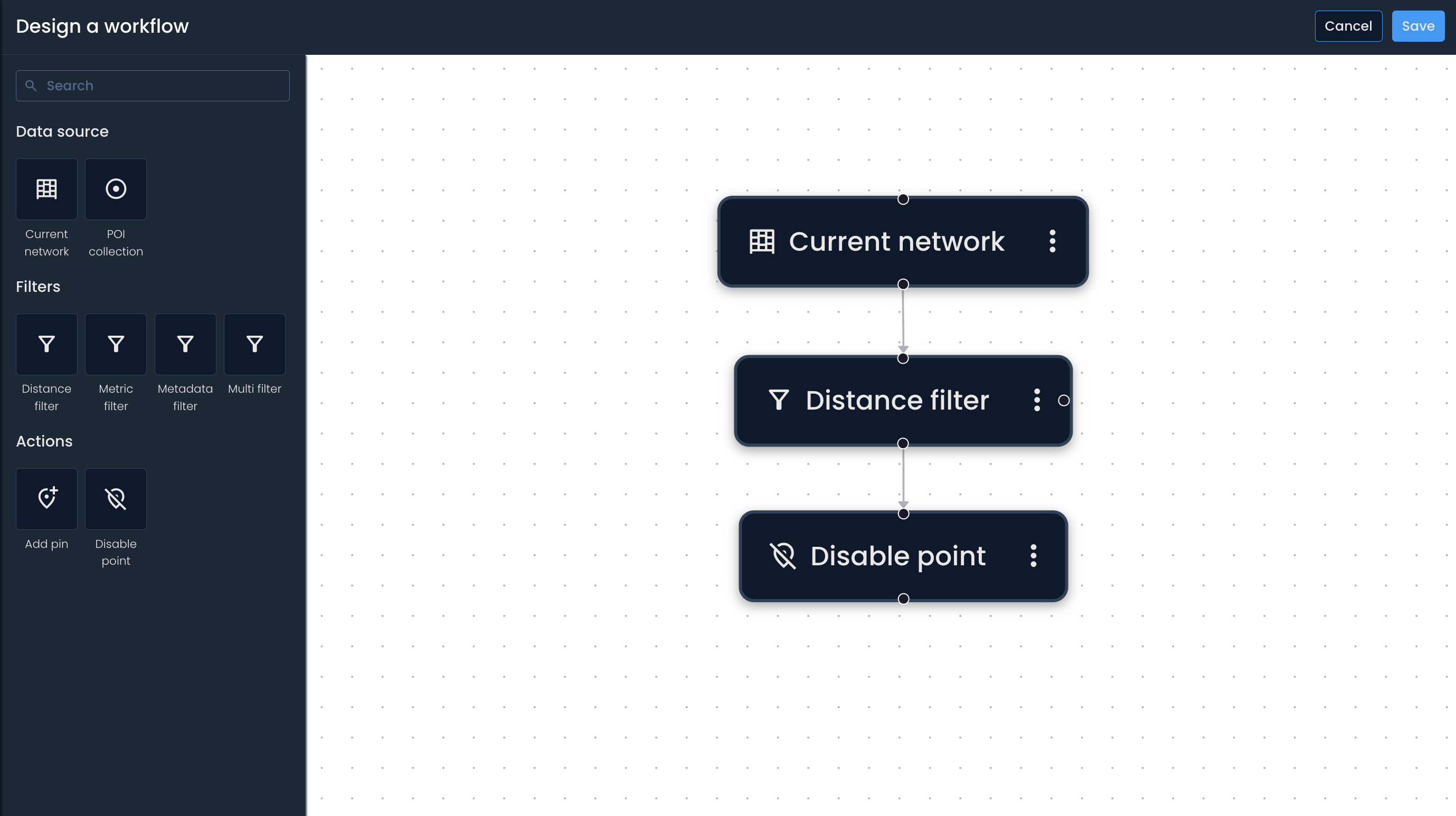 U Panelu blokova klikni izvor podataka kojim želiš da započneš (na primer, Trenutna mreža ili Kolekcija tačaka od interesa (POI)).